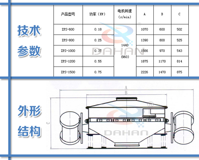 直排式振動(dòng)篩的技術(shù)參數(shù)及結(jié)構(gòu)示意圖: